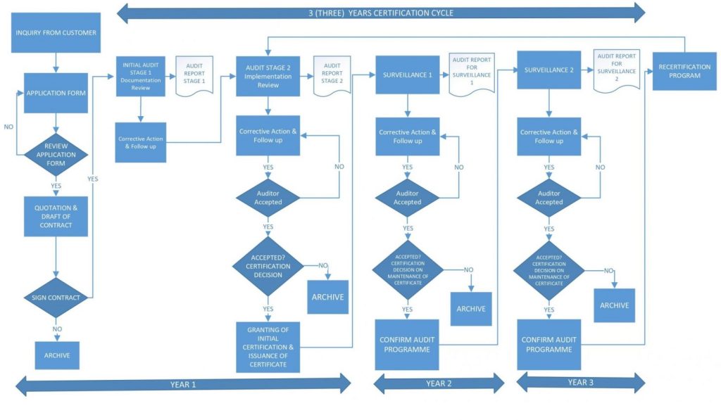 Berikut kami tampilkan gambaran alur kerja sertifikasi dalam satu siklus yang terstruktur. Diagram ini berfungsi untuk memberikan pemahaman menyeluruh tentang tahapan utama yang perlu dilalui dalam suatu program sertifikasi, mulai dari tahap awal hingga keberlanjutan sertifikat. Dengan visualisasi ini, organisasi dapat melihat bagaimana keseluruhan proses saling terhubung dan memahami alur yang harus diikuti dalam menjalani sertifikasi.